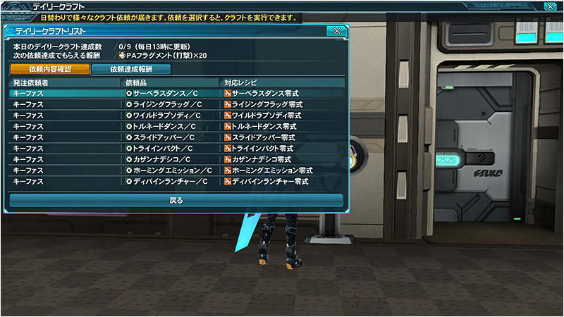The Daily Crafts menu will now include requests for PA Customization. In addition, there will also be crafting days specifically aimed at “Veteran” or “Entry Level” crafters. Their schedules are as follows: