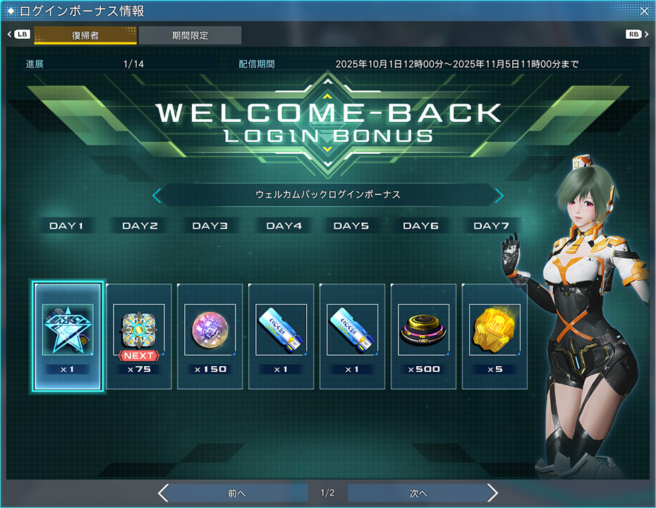 ARKS who are classified as "Returning Players" will have an exclusive Login Bonus sheet. Based on the amount of days you log in, you can receive prizes such as N-Earned EXP +30 Million and Storage Usage Tickets.