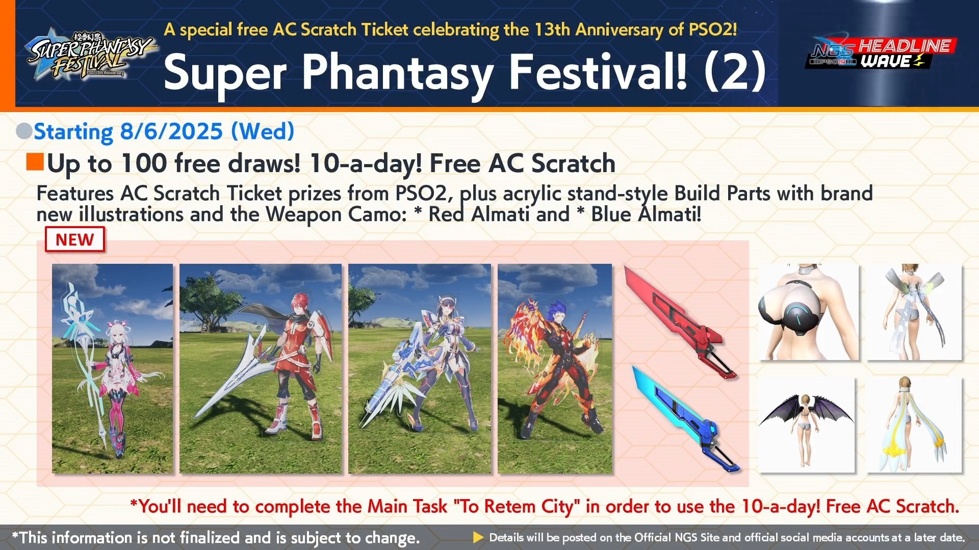 Players can draw 10 Free AC Scratch Tickets per day, up to a maximum of 100 draws overall. These free AC Scratch Tickets feature popular PSO2-spec items and acrylic stand Build Parts with new artwork of PSO2 characters such as Matoi and Zeno. Plus new items like the Red Almati and Blue Almati weapon camos.