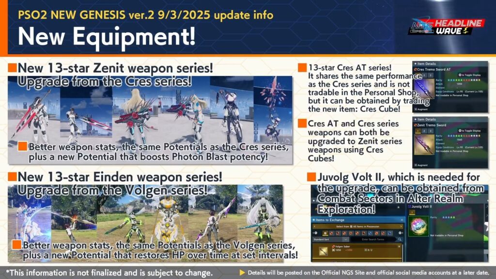 - The New ★13 Zenit weapon series is coming. You can upgrade to this series from the ★13 Cres Series. This series contains better weapon stats, the same potential as the Cres Series, plus a new potential that boosts Photon Blast power.