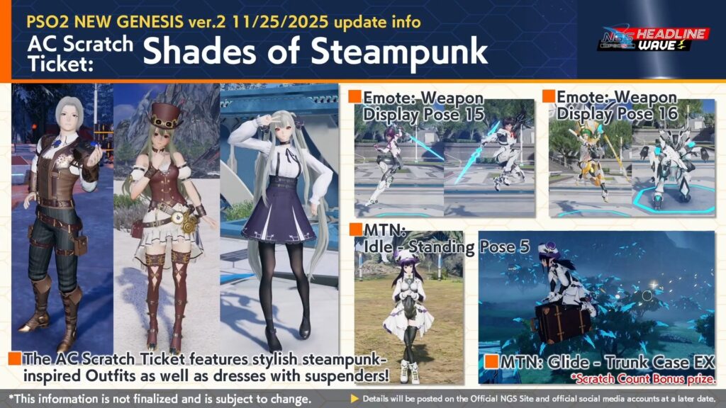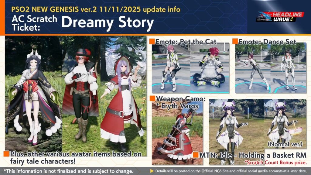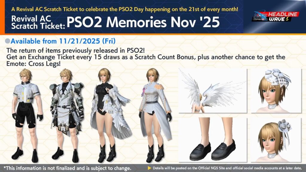 • Launches alongside PSO2 Day. Avatar items from PSO2 will return. Get an Exchange Ticket every 15 draws and the Lobby Action: Cross Legs.