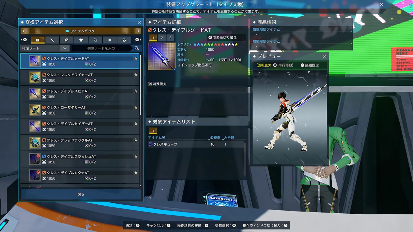 Next up is the Cres AT weapon series. This weapon has the same performance as the Cres series but cannot be sold in Player Shops. You can acquire it by trading in Cres Cubes! In addition, both Cres and Cres AT weapons can be upgraded to the Zenith series using Cres Cubes.
