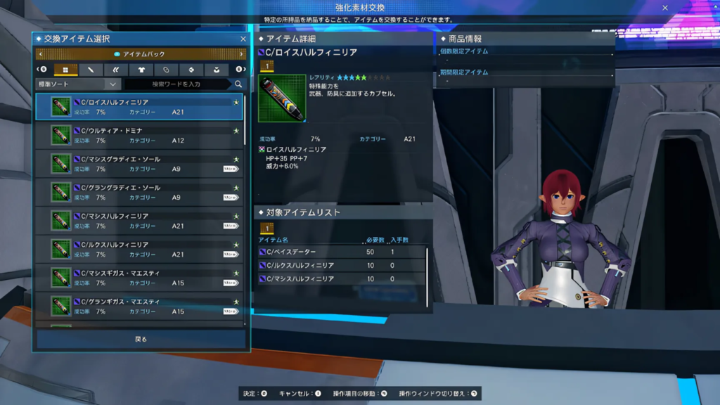 At the Item Lab, you can acquire Lois Halphiniria a new ability capsule that increases HP by 35, PP by 7 and power by 6%. You can get this by trading in Lux Halphiniria, Mascis Halphinilia, and Basedata.