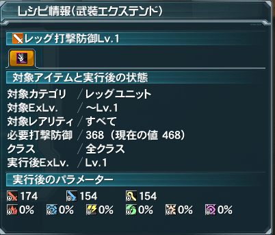Units on the other hand are separated into arms, legs, and rear, and are categorized by striking/range/tech defense. Though the final results for all recipes are the same values, you can change the required equipping stat based on the chosen defense type.